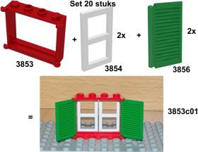 3853c01#20 Set 20 stuks Red Window 1 x 4 x 3 + 2x White Pane 1 x 2 x 3 + 2x Green Shutter 1 x 2 x 3 (3853+3854+3856)